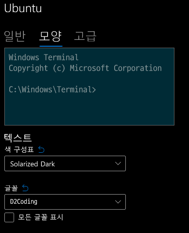 우분투-모양으로 들어가서 색 구성표는 Solarized Dark 글꼴은 D2Coding으로 변경해주세요.