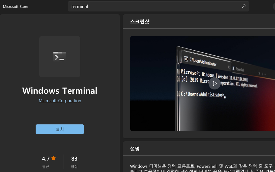 wsl을 사용하기 위해서 먼저 Microsoft Store에서 Terminal을 설치해줍니다.