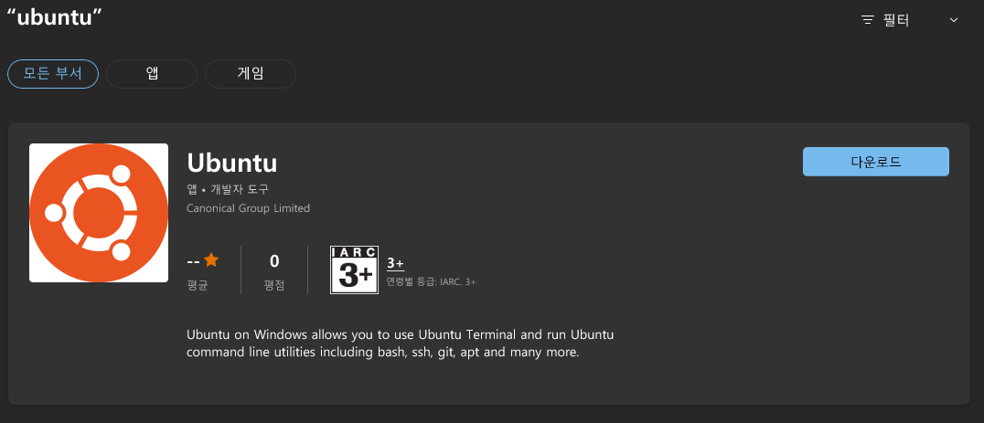 이렇게 뜬다면 밑에 다시 Microsoft Store에 접속해 Ubuntu를 검색 후 설치해줍니다.
