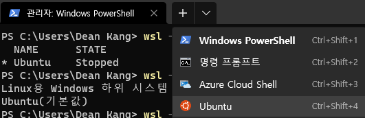 터미널 상단의 아래 방향 화살표 버튼을 눌러 우분투를 선택해주세요.