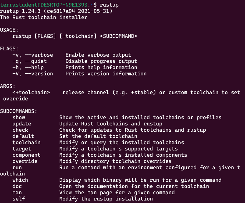 다음 rustup을 입력해 설치가 잘 되었는지 확인해봅니다.