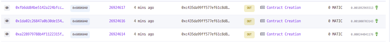 polyscan에서 배포된 컨트랙트를 확인합니다. from을 보면 3개의 컨트랙트가 배포된 것을 확인할 수 있습니다.