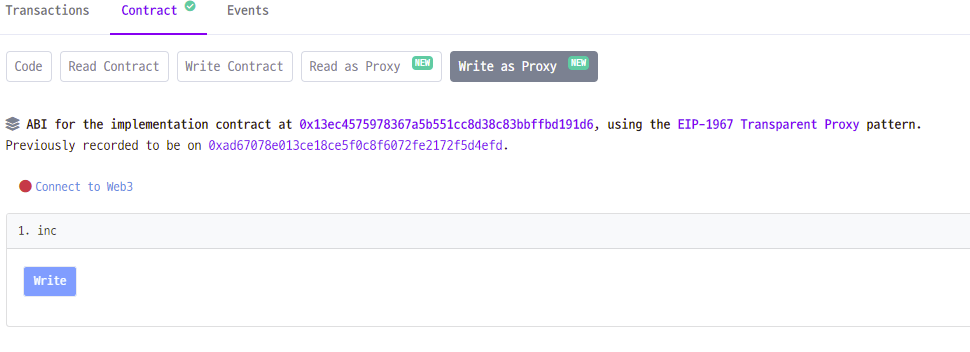 프록시 컨트랙트에서 Write as a proxy 탭을 들어가면 BoxV2의 함수인 inc를 볼 수 있습니다.
