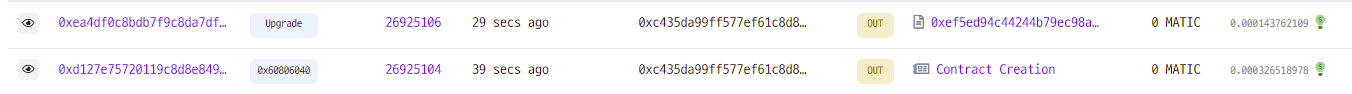 배포 후 2개의 트랜잭션이 발생했는데 1개는 새로 작성한 BoxV2이며 하나는 프록시를 업그레이드 하는 트랜잭션입니다.