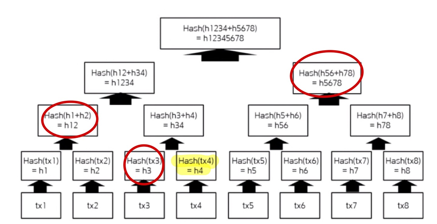 머클루트와 tx4의 해시값을 알고 있다고 가정할 때 h3, h12, h5678의 해시값만 알고 있다면 해당 블록에 tx4가 존재하는지 확인할 수 있습니다.
