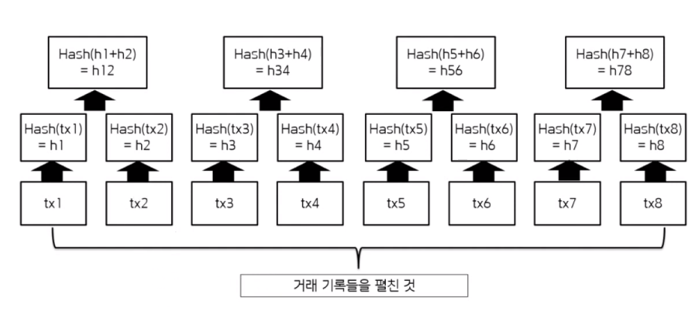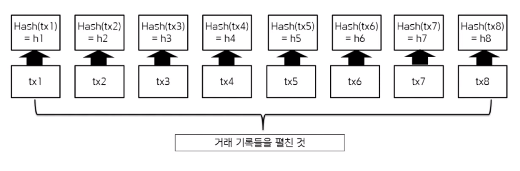 일련의 트랜잭션들을 해시 함수를 이용해 암호화합니다.