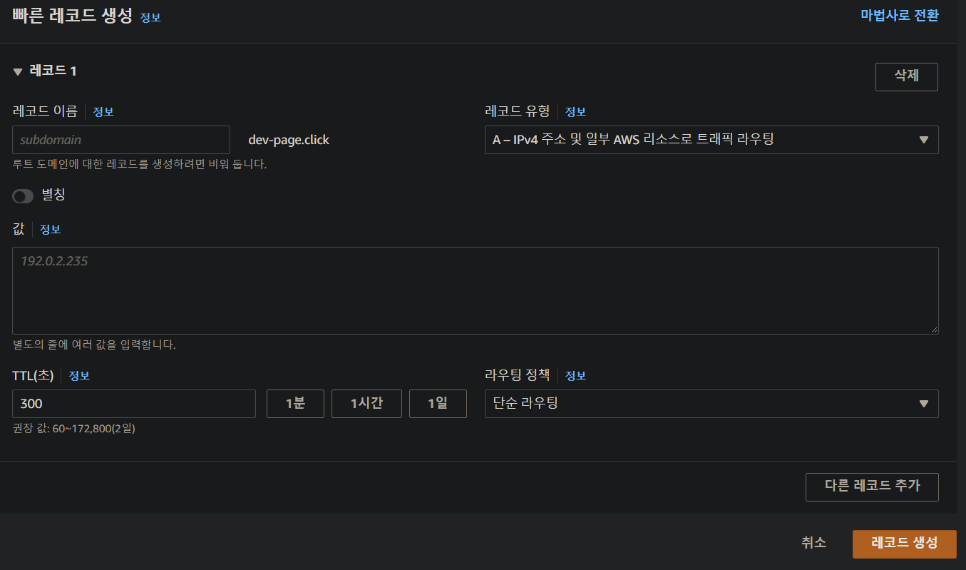 값에는 ec2의 퍼블릭 ipv4 주소를 입력한 후 레코드를 생성합니다.
