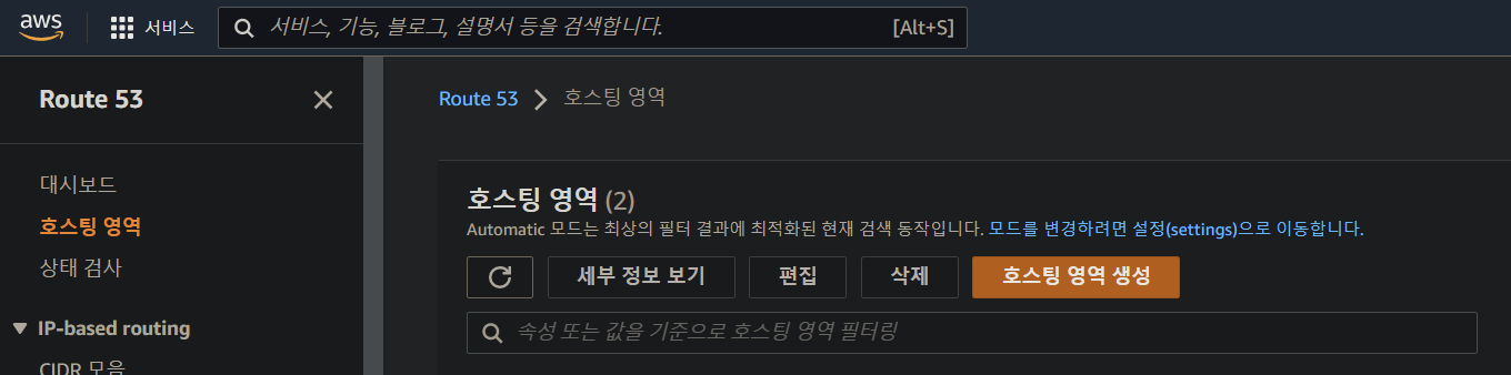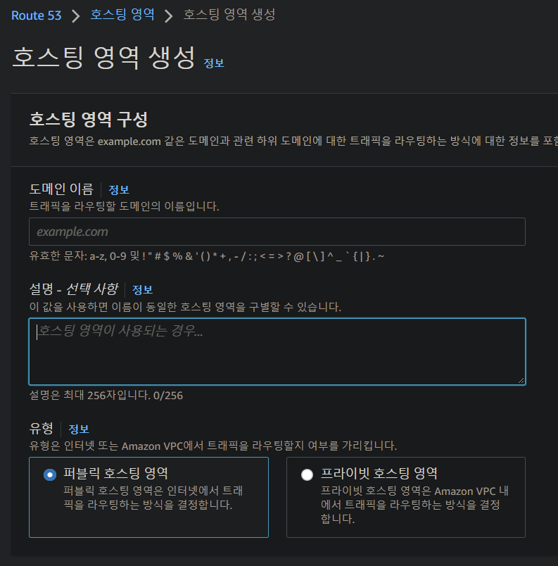 AWS의 Route 53에 접속 - 호스팅 영역 - 호스팅 영역 생성에 들어가서 구매한 도메인을 등록합니다.