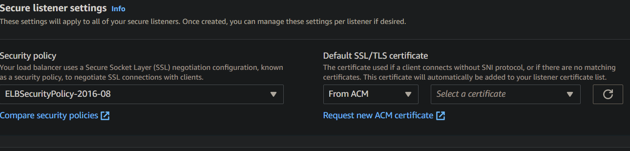 하단에 Secure listener settings가 새로 생겼을 텐데 Default SSL/TSL certificate에서 아까 생성한 인증서를 선택합니다.