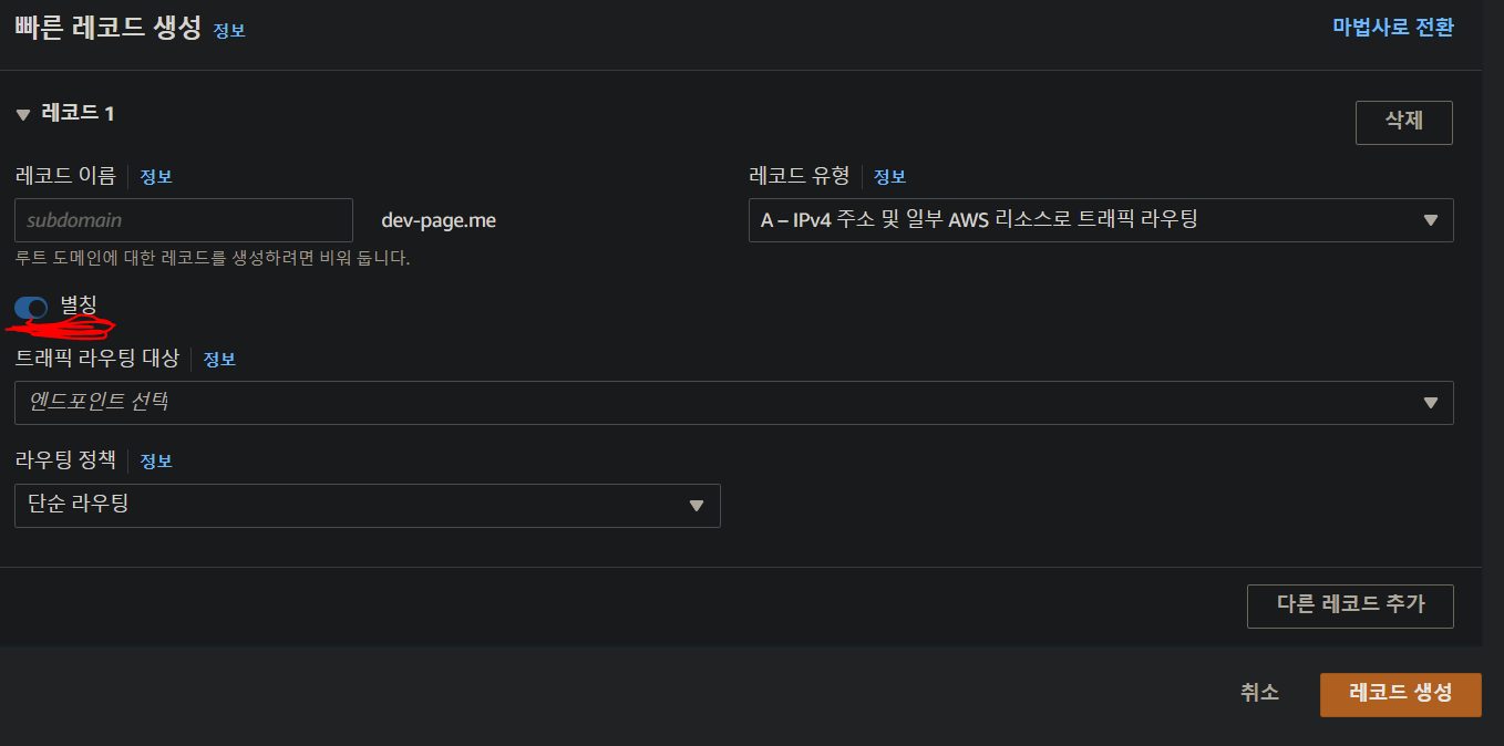 여기까지 진행 후 로드밸런서를 생성했다면 다시 route 53에 레코드에 들어가서 아까 인스턴스의 ipv4 주소를 입력한 레코드를 삭제 후 다시 레코드를 생성합니다.